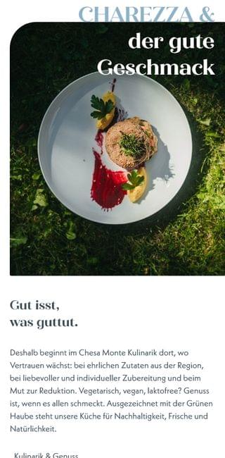 Für das 4 Sterne superior Hotel Chesa Monte in Fiss entstand eine Website, die den Spagat zwischen Authentizität und Storytelling ganz easy schafft. Die neue Positionierung zwischen rätoromanischer Vergangenheit und modernem Lifestyle wurde dabei mit Charezza stimmig ins Digitale übersetzt. Konzeption, Design, technische Realisierung und sämtlicher Content fokussieren mit geballter Energie auf die Werte Identität, Atmosphäre und Klarheit.