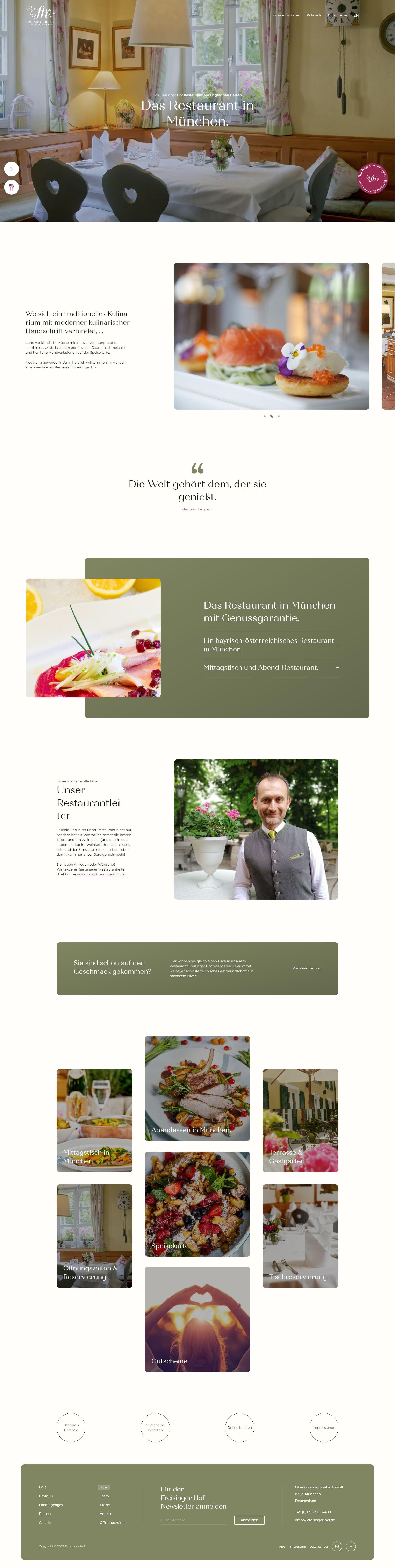 Das Redesign der Website des Hotels Freisinger Hof in München spiegelt den klassischen Charme des Hauses wider und verbindet diesen mit modernen Designelementen. Die Farbgebung und die Bildauswahl sind gezielt darauf abgestimmt, die Nähe zum Englischen Garten zu betonen und die natürliche Umgebung des Hotels zu transportieren. Mit klaren Strukturen und einer benutzerfreundlichen Navigation steht die Präsentation der Hotelangebote im Vordergrund, während moderne Akzente ein stilvolles und einladendes Online-Erlebnis schaffen.
