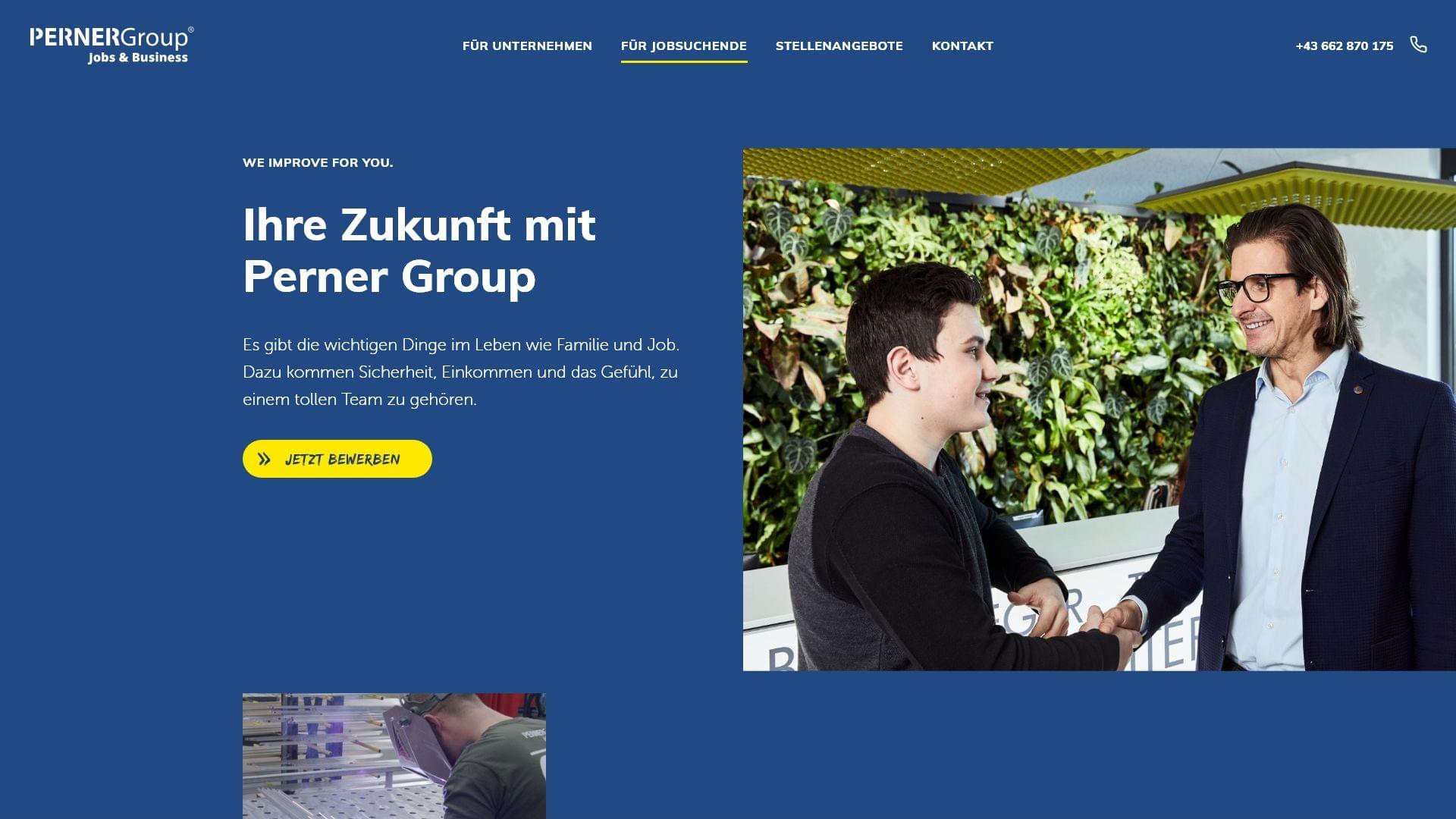 Der zwischenmenschliche Aspekt zeichnet die Perner Group aus. Die PERNER GROUP ist für dich da. Daraus hat sich der zentrale Slogan „WE FOR YOU“ entwickelt und damit tritt das Unternehmen nach Außen auf. Ergänzt wird dieser, je nach Dienstleistung, durch Erweiterungen wie z.B. organize, fight, care, check. Um das persönliche Engagement und die Handschlagqualität zu unterstreichen, werden die Mitarbeiter als Testimonials vereinzelt im Webauftritt eingesetzt. Die Farbwelt und das individuelle Design spiegeln die Werte des Unternehmens wider.